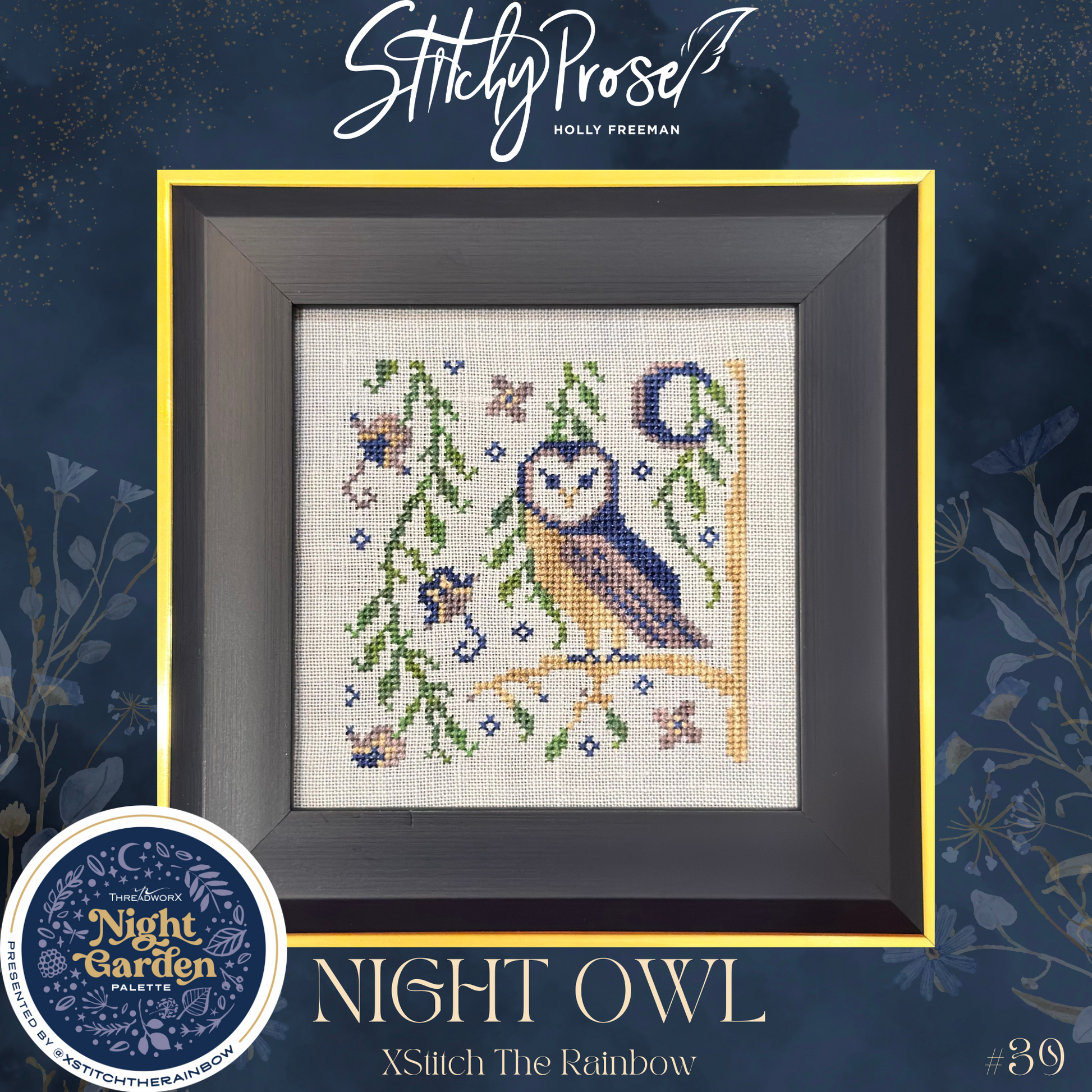 Perched beneath a canopy of a flowering tree, this wise owl vows to watch over the Night Garden where flowers whisper, stars glow, and needles stitch dreams by the light of moonbeams. This is my owl-ficial contribution for the XStitch-the-Rainbow’s Night Garden Collaboration using the ThreadworX Night Garden palette! There are 22 participating designers.